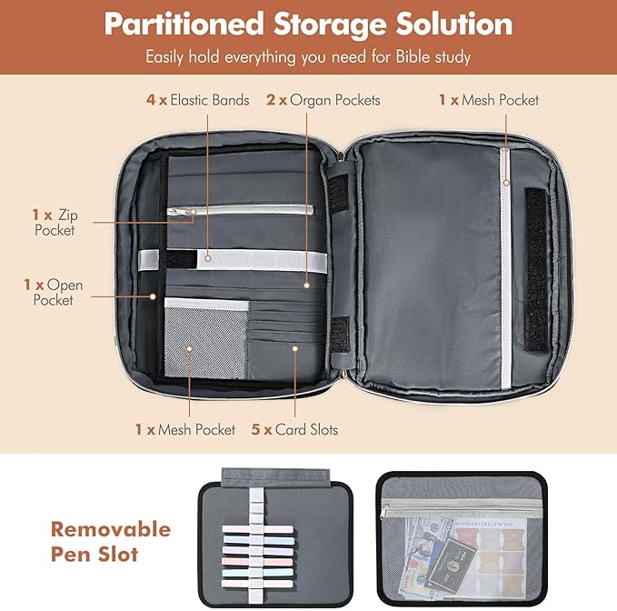 * Multi-compartment design keeps your Bible and other daily essentials organised and within easy reach.