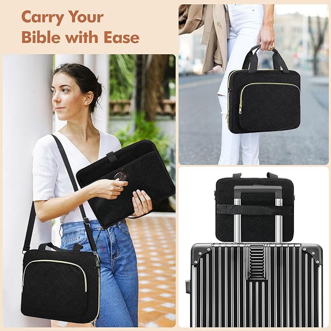 MoKo Bible Cover, Large Bible Cover Case for Women, Multi-Pockets Bible Carrying Church Bag Bible Book Cover with Pen Slots, Handle & Shoulder Strap, Black