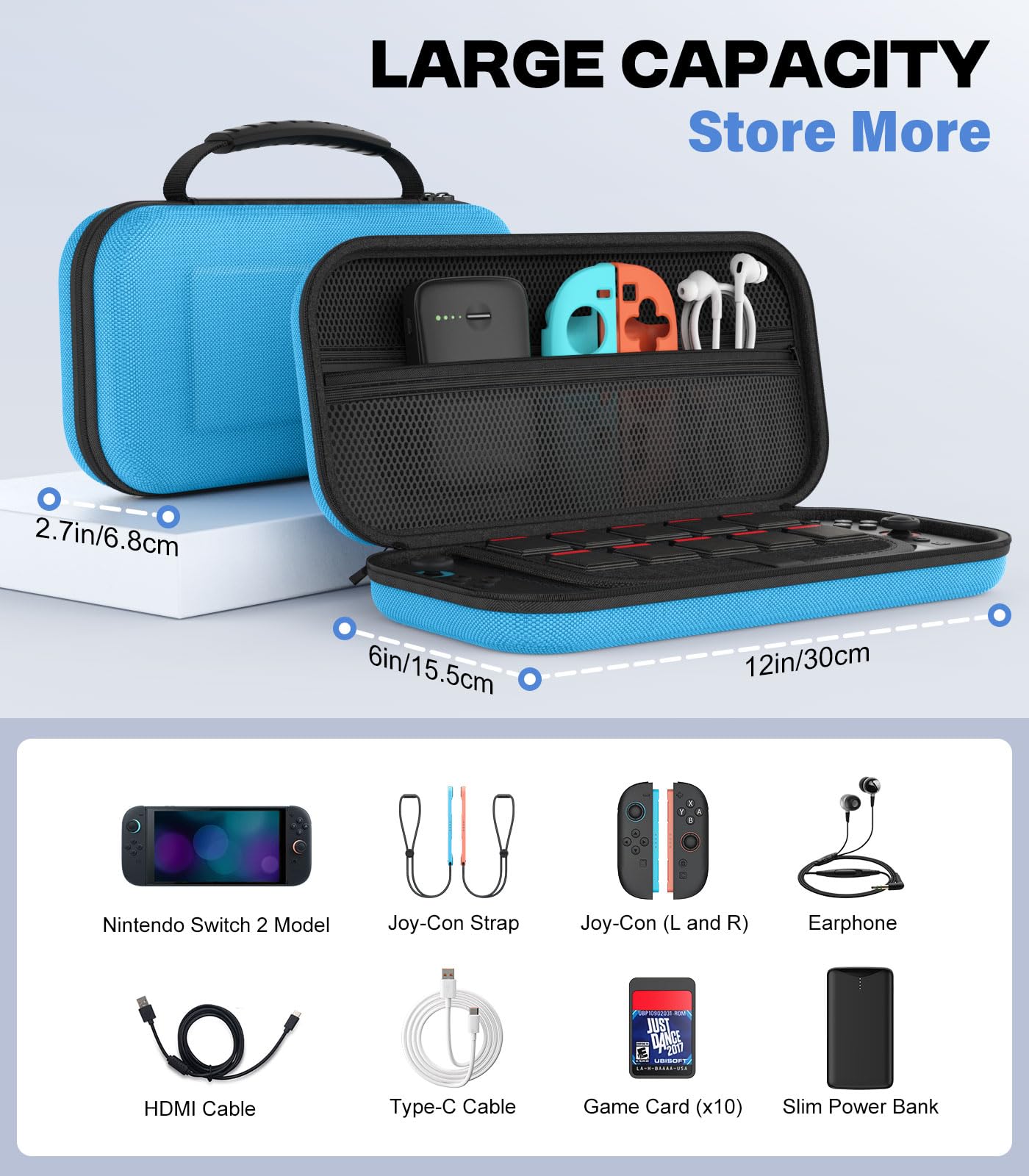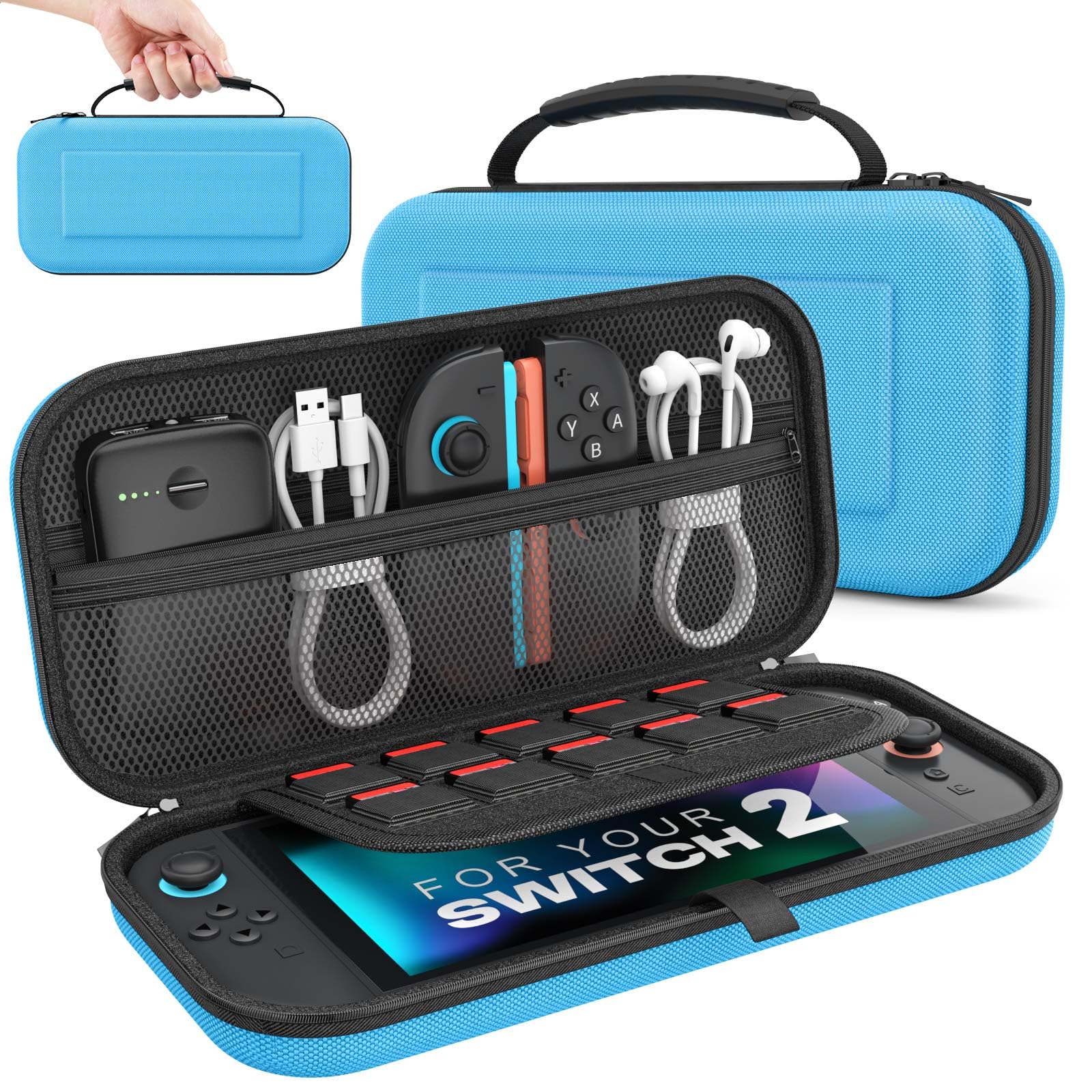 MoKo Carrying Case for Nintendo Switch 2 2025, Protective Hard Shell Portable Travel Carry Case Pouch Holds 10 Cartridges w/Pockets for Switch 2 Accessories and Games, Blue
