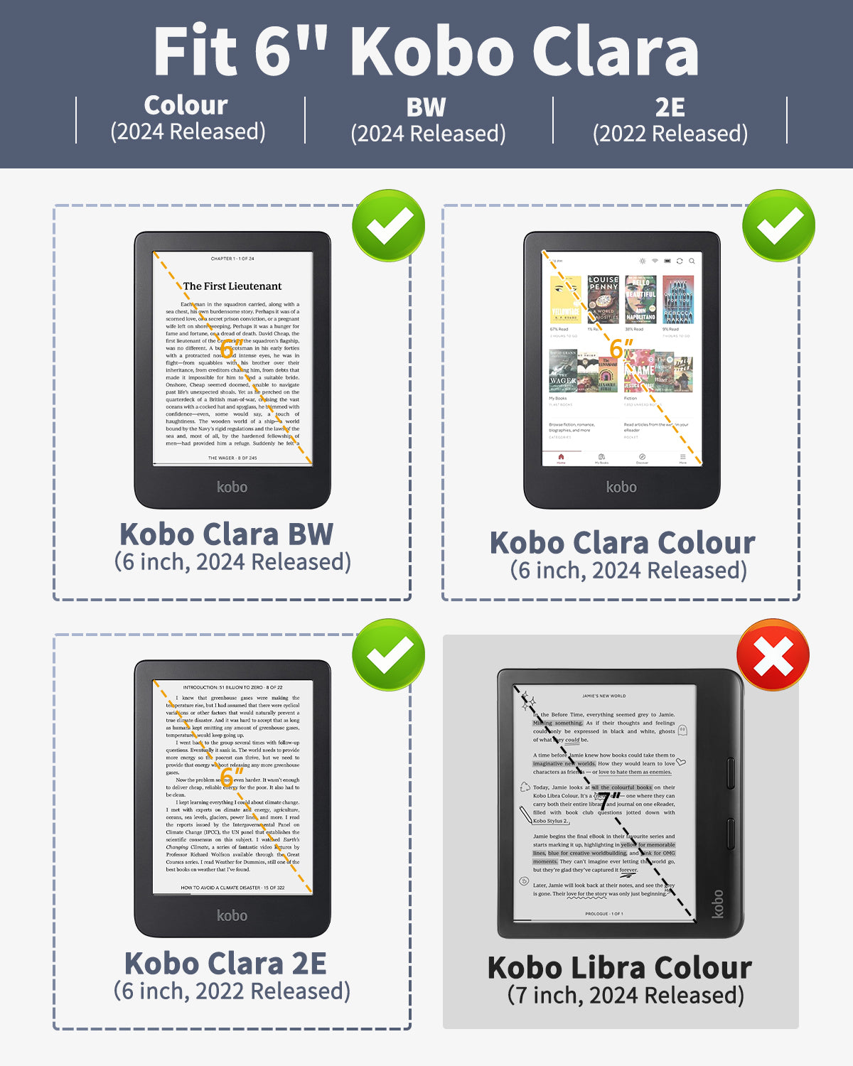 Compatibility: Only designed to fit Kobo Clara BW (Model N365) / Kobo Clara Colour (Model N367) 6" 2024 Release / Kobo Clara 2E 6-Inch 2022. Don't fit any other Kobo E-reader.