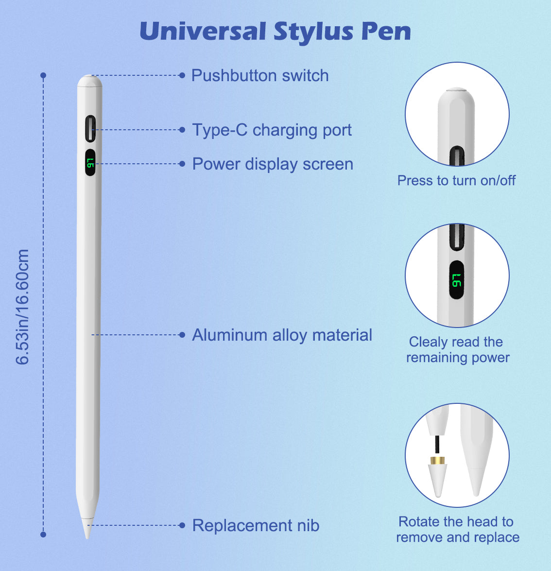【Fast Charging and LED Power Display】: With Type-C charging port and built-in 135Ah lithium battery, the stylus pen takes only 35-40 mins to fully charge and can work continuously for 10 hours. The stylus will automatically turn off to save power after 10 minutes of inactivity. The LED power display screen provides clear reading of the specific remaining power. (Note: After turning on the pen, the digital panel shows its power level, then display "-", press the button again to display power.)【Smooth and Sensitive】: With a sensitive nib, the stylus pencil for touch screen provides you with a smooth and precise point-and-click writing experience, sliding smoothly on the tablet screen and allowing you to create with maximum precision at all times. The pen nib has good wear resistance and can be replaced, coming with 4 nibs for your spare use. Perfect for daily writing, drawing, and note-taking. (Note: This stylus does not support "palm rejection" and "tilt function". )